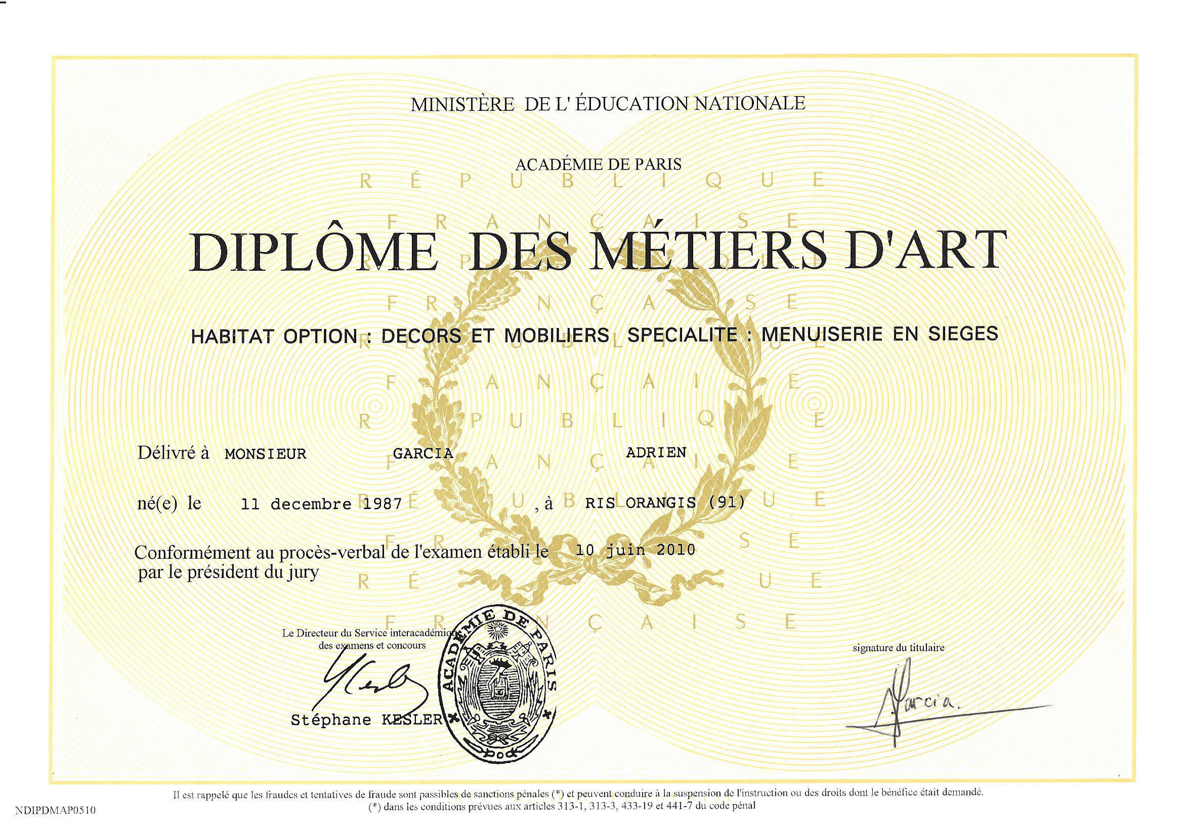 Diplôme des Métiers d’Art.